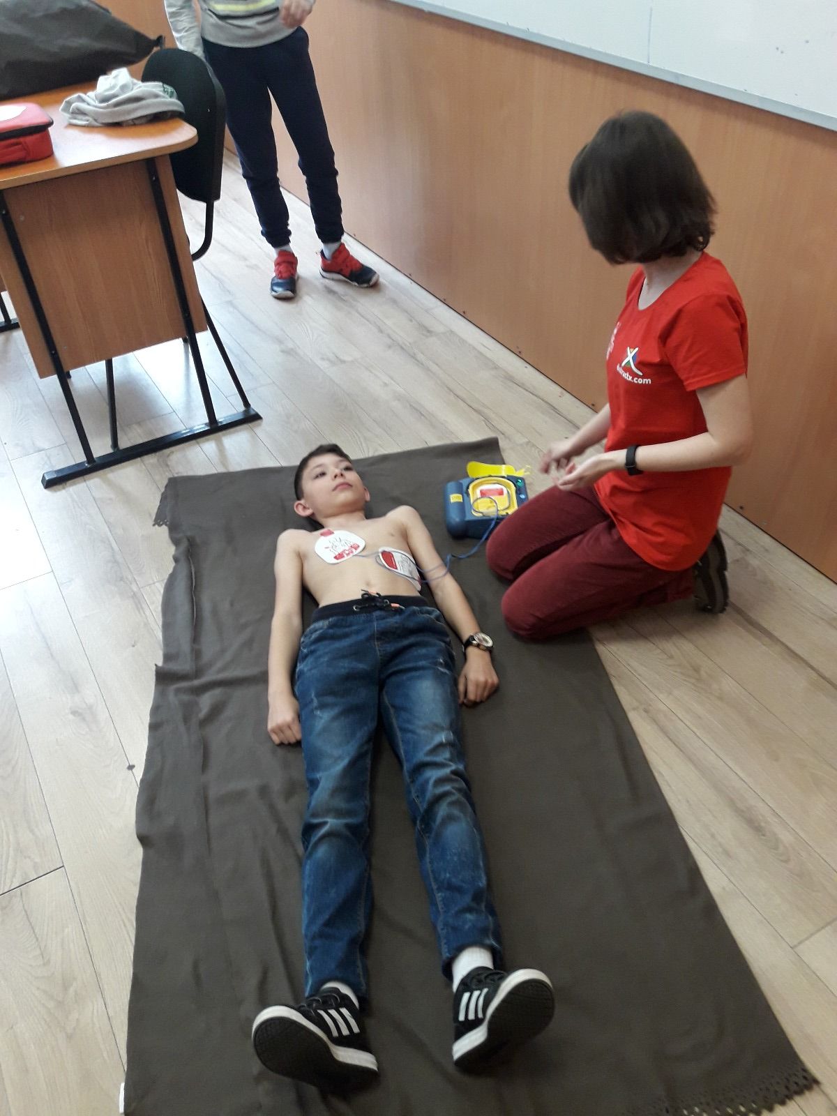 - Folosim materiale profesionale, precum manechine de resuscitare, veste pentru manevra Heimlich, defibrilatoare reale si pentru training.